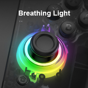 - [Cool Black Semi-transparent & Colorful RGB] All-inclusive transparent appearance on this switch Joycon, is extremely eye-catching. Seven-color light ring and three lighting modes of monochrome, breath, and rainbow for you to customize.