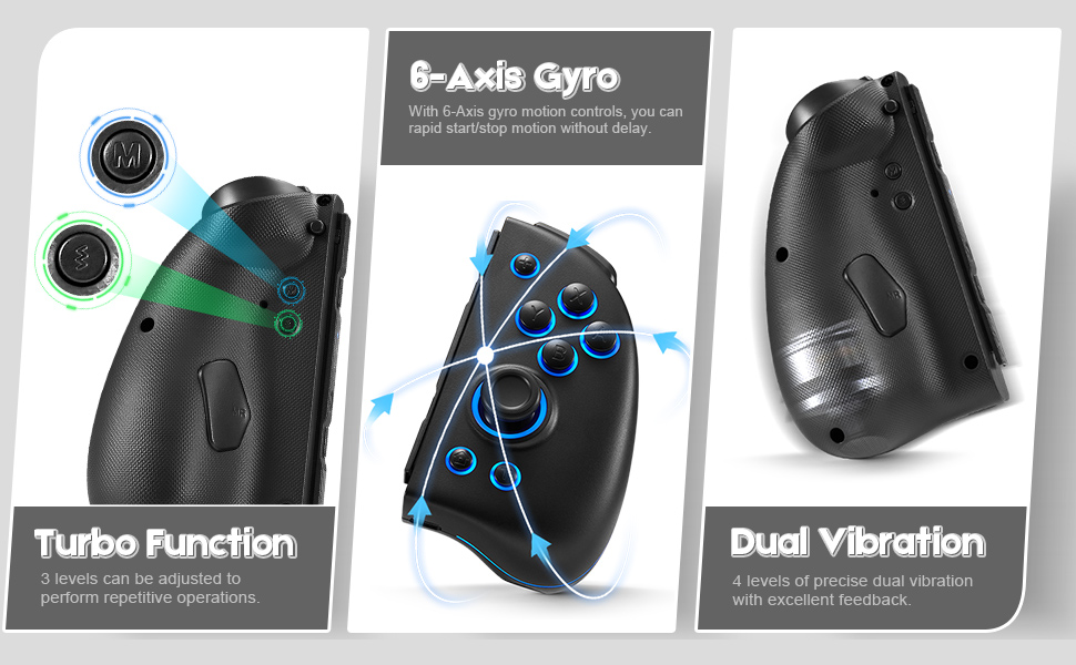 - [Turbo Function and Precise Motion Controls] Improve the game's accuracy and precision! This switch Joycon can customize the turbo with any button to free players’ fingers and adjust the turbo speed to fit different games. Joypad controllers also have built-in 6-Axis gyro motion controls to rapid start/stop motion without delay.